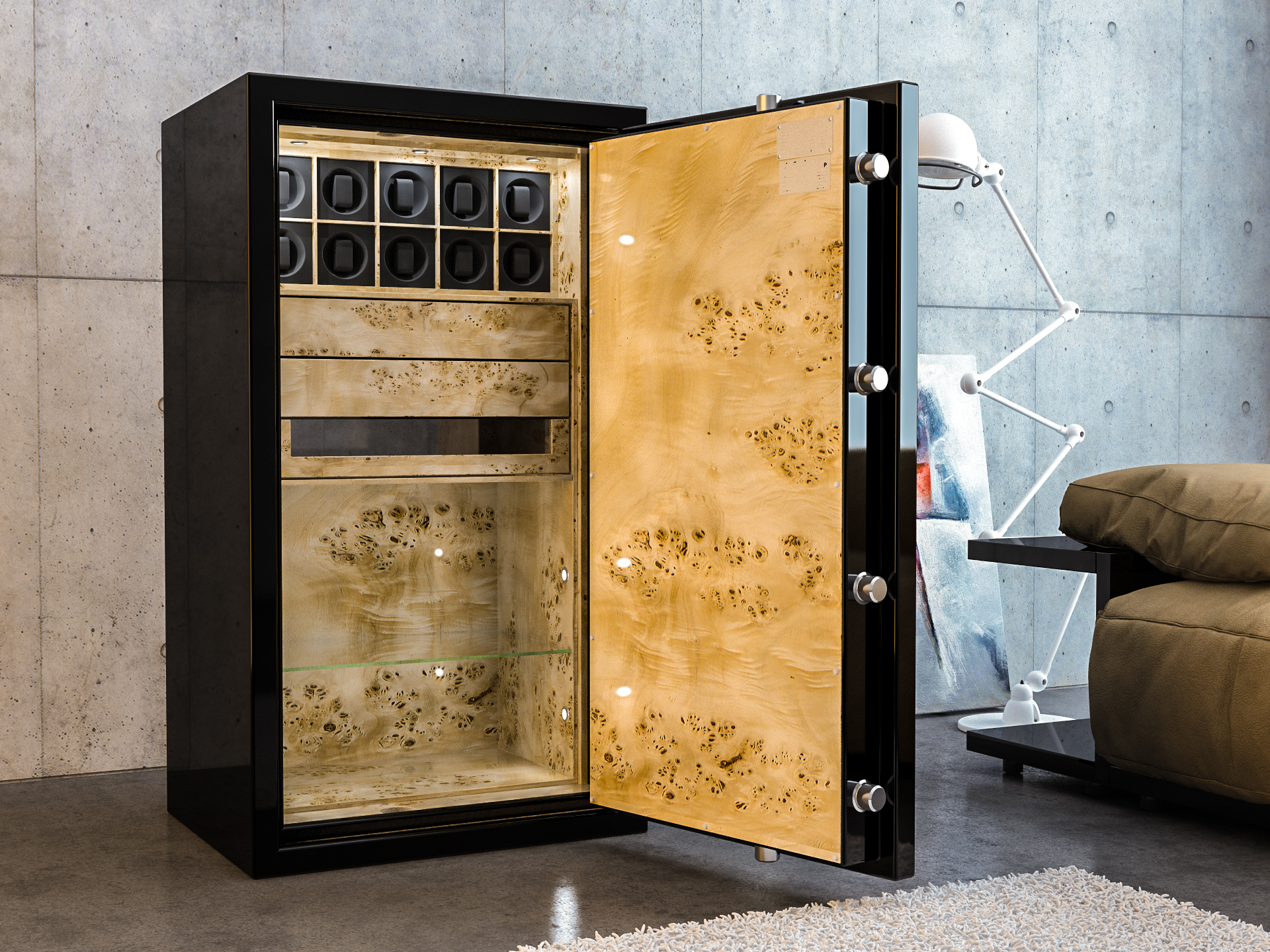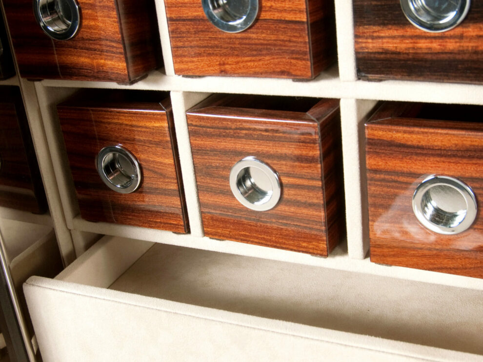 - Options personnalisables : Choisissez parmi divers matériaux et finitions pour un coffre-fort qui reflète vos goûts personnels : finition parfaite avec du métal, du bois, du verre ou du cuir.