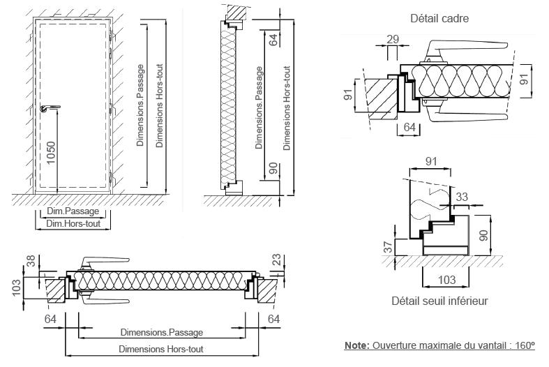 - Description : Porte acoustique de 91 mm d’épaisseur, composée d’un cadre et d’un vantail métalliques en tôle polie de 1,5 mm d’épaisseur.