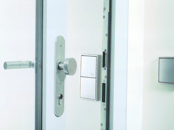 Pour une exécution conforme aux normes DIN en tant que serrure anti-panique, la serrure blueMotion peut être combinée avec un cylindre débrayable doté d’une fonction antiblocage/FZG. Elle s’adapte également à la plupart des systèmes de contrôle d’accès externes via un contact sec.