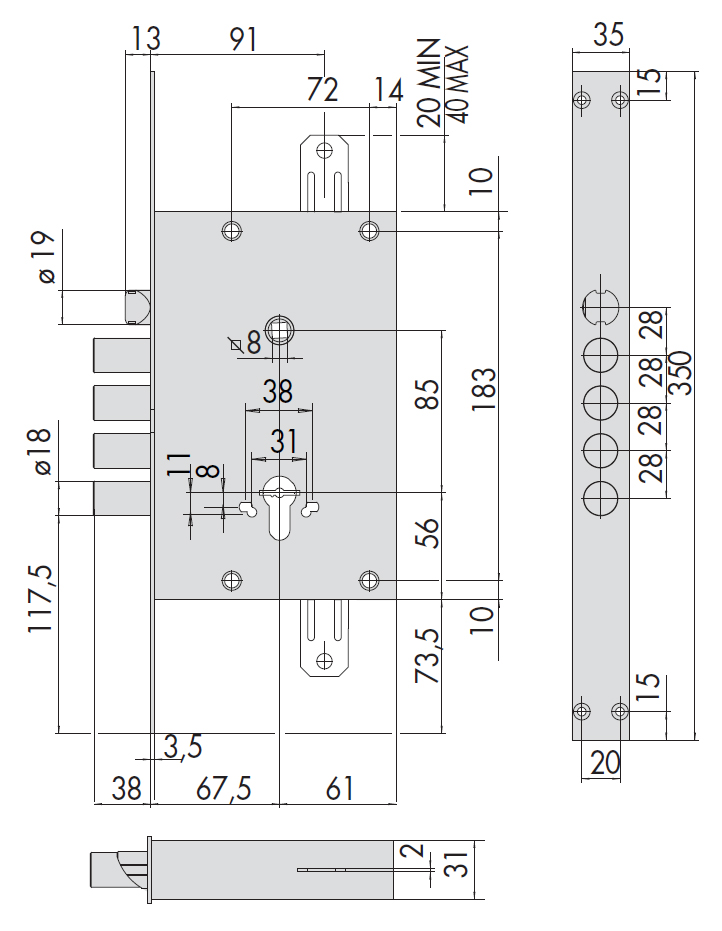 - Pêne dormant central formé par 4 points d’ancrages de Ø 18 mm