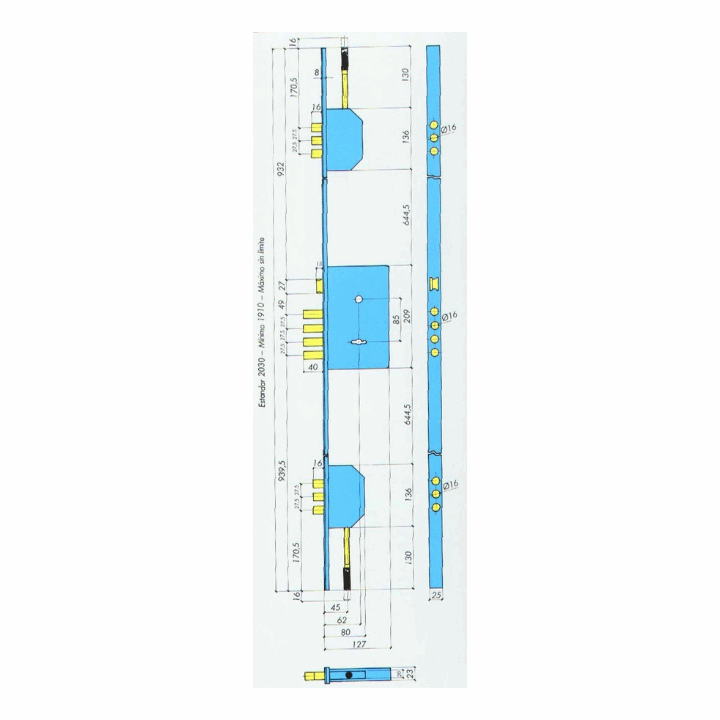 - Pêne dormant central : Constitué de quatre cylindres de Ø 16 mm, deux séries de trois pênes dormants Ø 16 mm disposés à +/- 645 mm vers le haut et vers le bas du boîtier central