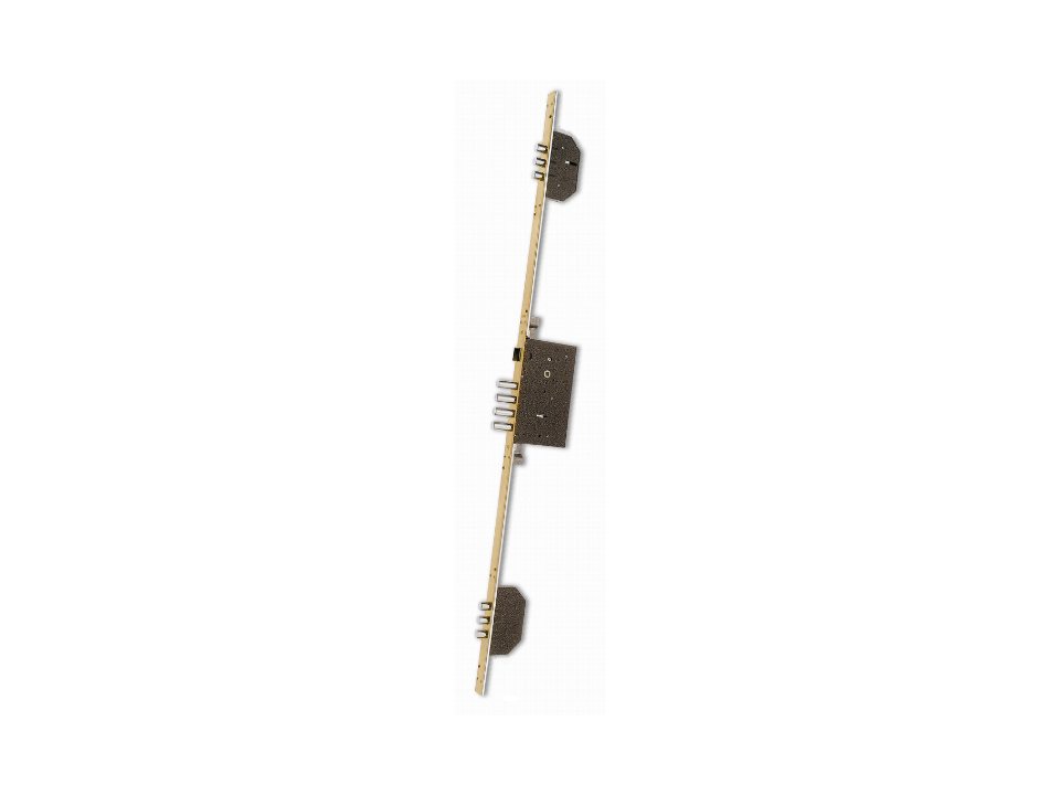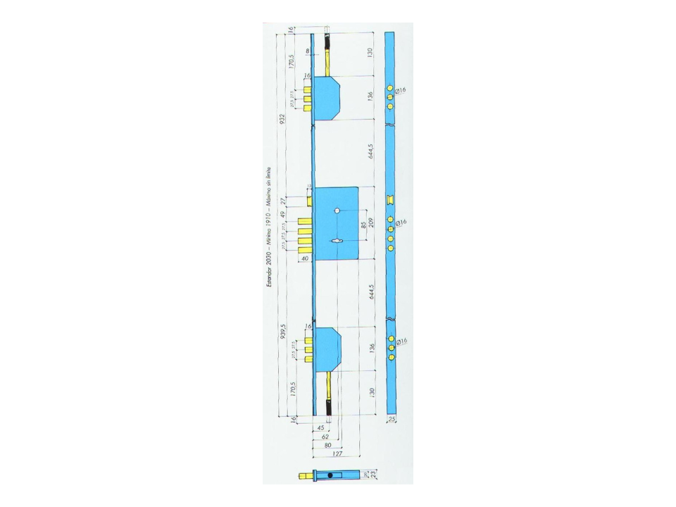 - Pêne dormant central : Constitué de quatre cylindres de Ø 16 mm, deux séries de trois pênes dormants Ø 16 mm disposés à +/- 645 mm vers le haut et vers le bas du boîtier central