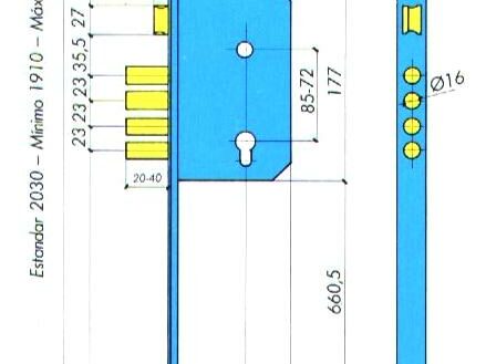 - Points d’ancrage : Un pêne dormant central avec quatre cylindres de Ø 16 mm, deux séries de trois pênes dormants Ø 16 mm disposés à +/- 645 mm vers le haut et vers le bas du boîtier central