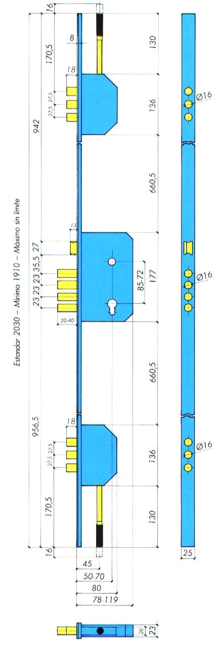 - Points d’ancrage : Un pêne dormant central avec quatre cylindres de Ø 16 mm, deux séries de trois pênes dormants Ø 16 mm disposés à +/- 645 mm vers le haut et vers le bas du boîtier central