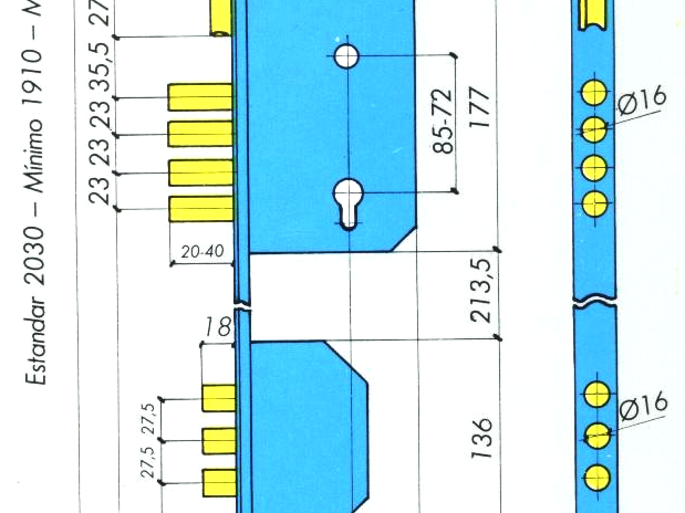 - Points d’ancrage : Un pêne dormant central avec quatre cylindres de Ø 16 mm, deux séries de trois pênes dormants Ø 16 mm disposés à +/- 645 mm vers le haut et vers le bas du boîtier central et deux séries de trois pênes dormants Ø 16 mm disposés à +/- 200 mm