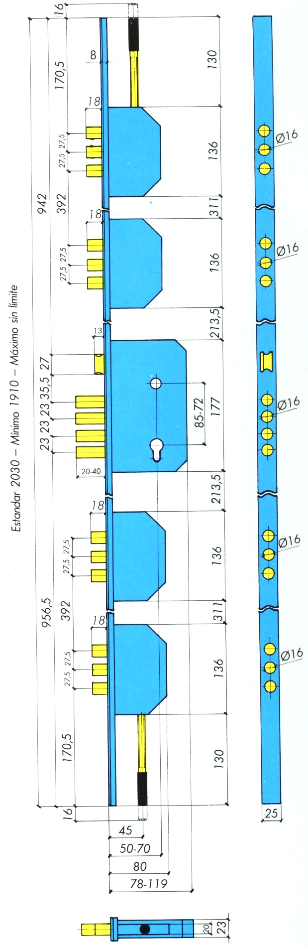 - Points d’ancrage : Un pêne dormant central avec quatre cylindres de Ø 16 mm, deux séries de trois pênes dormants Ø 16 mm disposés à +/- 645 mm vers le haut et vers le bas du boîtier central et deux séries de trois pênes dormants Ø 16 mm disposés à +/- 200 mm