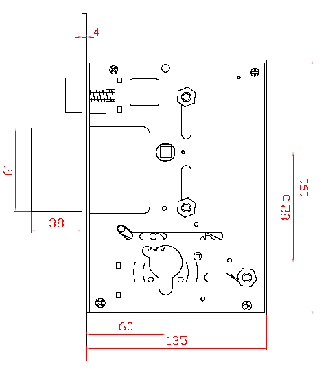 - Pêne dormant central : 40 x 60 x 13 mm avec une course de 40 mm en un tour de clé