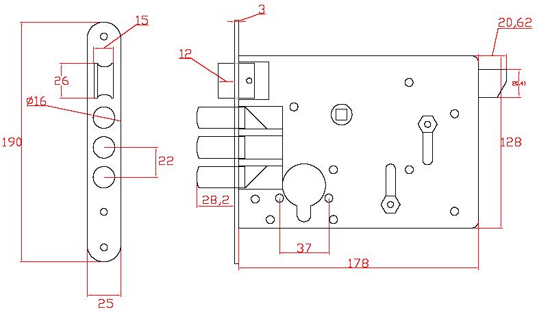 - Pêne dormant central : Trois cylindres de Ø 14 mm