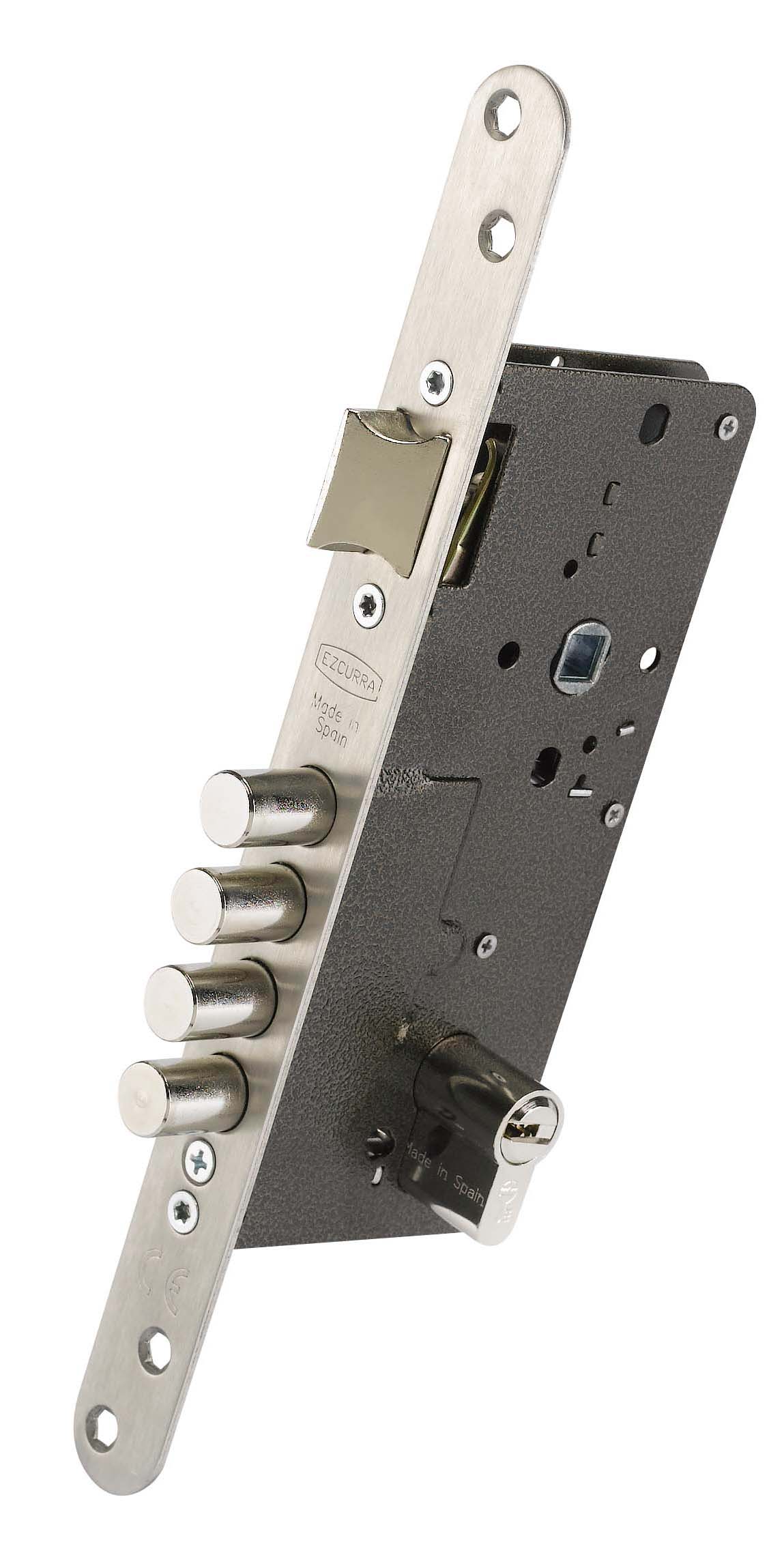 La serrure Ezcurra Mod. 700B est équipée de quatre points, est conçue pour les cylindres européens et est compatible avec les protège-cylindres modèles EZ 420P ou Al 85.
